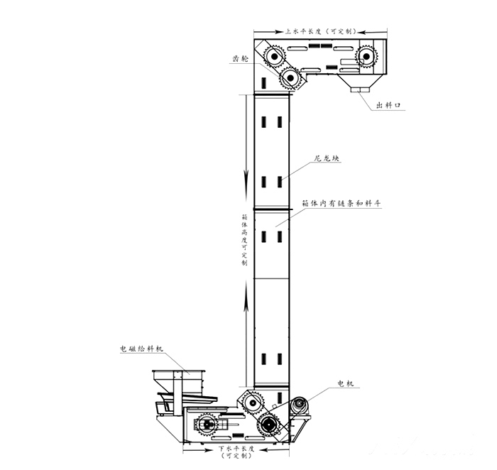 Z型斗式提升機通過掛在鏈條上的料斗輸送物料,隨著鏈條提升到頂部,繞過上輪然后向下轉動,通過卸料口的卸料裝置完成單點或多點卸料(多點卸料不是多點同時卸料)。另外Z型斗式提升機一般都裝有提升機外殼板,以防止粉塵在斗式提升機中飛揚。